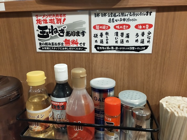 ラーメンの食券と渡すと、油の量、味の濃さ、麺の硬さを聞かれる。